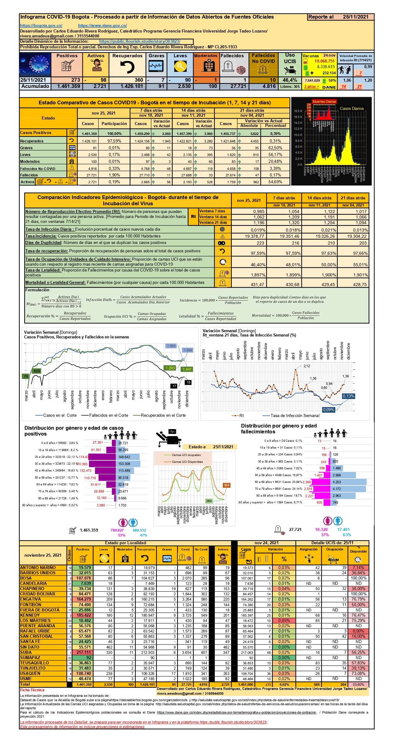 Con relación a Bogotá, en esta se llegó a 1’461.359 casos positivos, 1’426.101 casos recuperados, 2.721 personas activas con el virus y desafortunadamente han fallecido 27.721 personas; si se mira la ventana epidemiológica, el día de corte del artículo se detectaron 273 casos positivos y en los 21/14 y 7 días anteriores fueron 5.622/3.960 y 2.060 casos respectivamente; la misma ventana epidemiológica, pero para la letalidad indica que desde el 4 de noviembre se presentaron 47 muertes, desde el 11 de noviembre 33, desde el 7 de noviembre 11 y el día de corte solo una muerte.