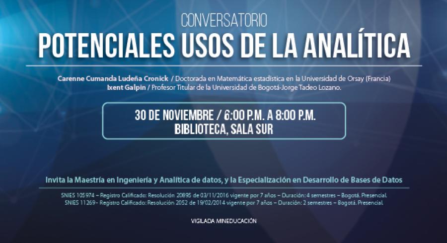 La analítica de datos es la profesión del presente y del futuro, en un mundo globalizado y permeado por la información. Allí, áreas como la estadística, la minería de datos y la computación convergen con el fin de transformar datos en bruto en conclusiones útiles para la toma de decisiones en cualquier escenario. Sobre los potenciales usos de la analítica, hablarán en Utadeo los profesores de la Maestría en Ingeniería y Analítica de Datos y de la Especialización en Desarrollo de Bases de Datos, Carenne Cumanda Ludeña e Ixent Galpin, el próximo 30 de noviembre, a partir de las 6:00 p.m., en la Sala Sur de la Biblioteca.
