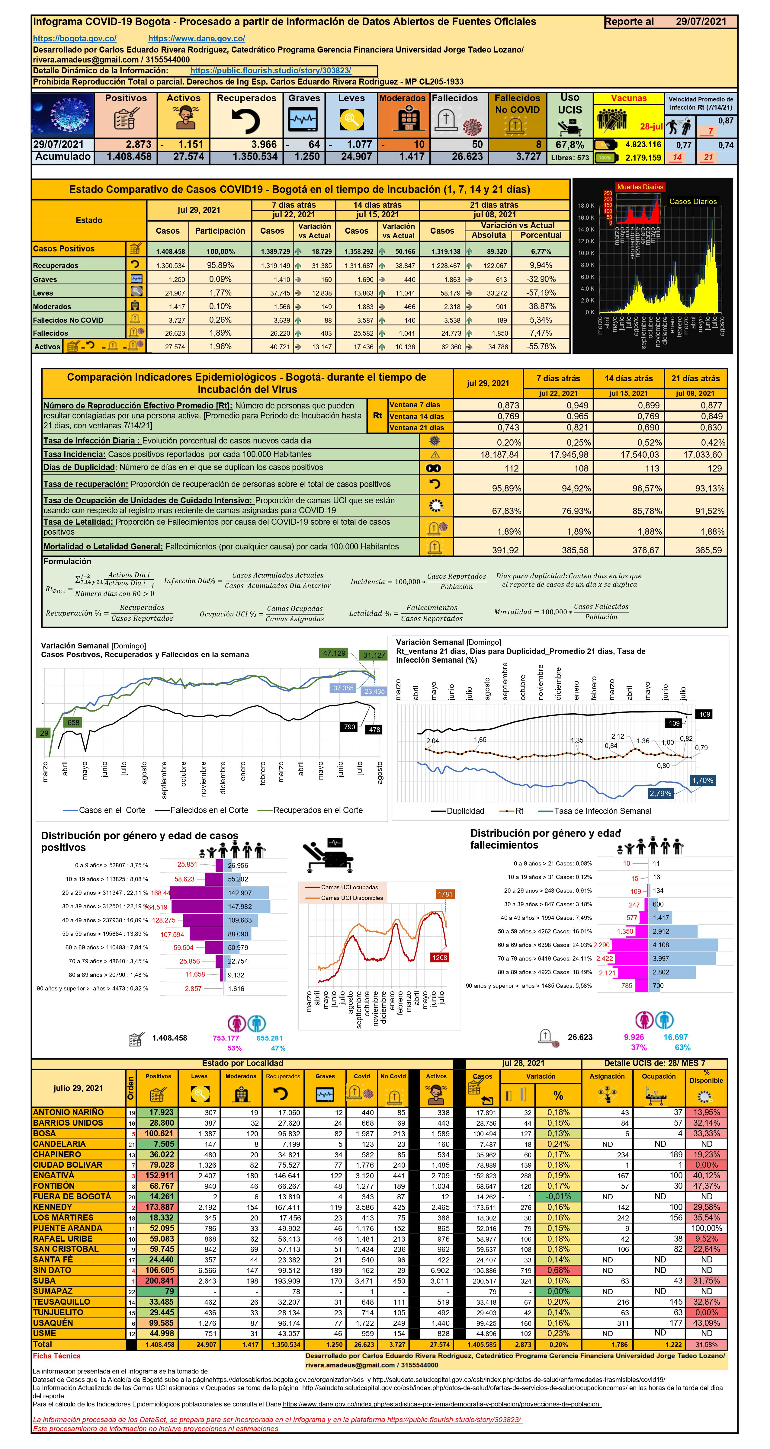 La tasa de incidencia a corte del informe es de 18.187 casos por cada 100.000 habitantes; se han recuperado 1'350.534 personas, equivalente al 95,89% de los casos positivos. Han fallecido 26.623 personas (tasa de letalidad 1.89%) y que para el día de corte fue de 50 personas; se cuenta con una disponibilidad de 573 camas en unidades de cuidado intensivo de una capacidad de 1.786 asignadas instaladas y que equivale a una ocupación del 67.8%, en comparación con el 8 de julio que presentó una ocupación de 91.52%; a nivel local con una disponibilidad de UCIS menor al 10% encuentran Tunjuelito y Ciudad Bolívar con (0%), Rafael Uribe con 7.52%.
