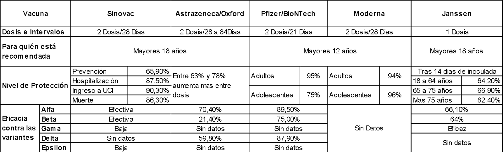 Como complemento a lo expuesto antes, recordemos que actualmente hay varias vacunas en uso contra COVID-19, el primer programa de vacunación masiva comenzó a principios de diciembre de 2020 y según reporta ourworldindata.org al 29 de julio de 2021 se han administrado 4,01 Billones de dosis, 35.6 millones se administran cada día, el 27,8% de la población mundial ha recibido al menos una dosis, y el 14,2% presenta un esquema completo de vacunación. Desde el inicio de inoculación, las casas farmacéuticas hacen un seguimiento a sus productos, y han manifestado que los riesgos de efectos secundarios graves de las vacunas son mínimos en comparación con el riesgo de la enfermedad en sí. Se relaciona en este artículo un comparativo de algunas características de las vacunas disponibles en Colombia con información actualizada por medscape.com para el 29 de julio.