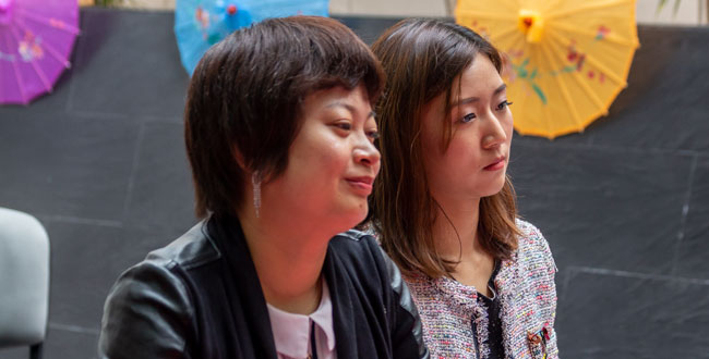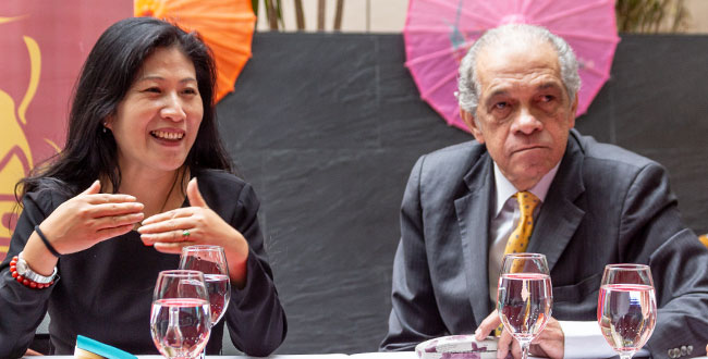 Thang Lu, directora del Global Education Center de la Universidad Normal del Este de China, y Enrique Posada, director del Instituto Confucio de Utadeo.