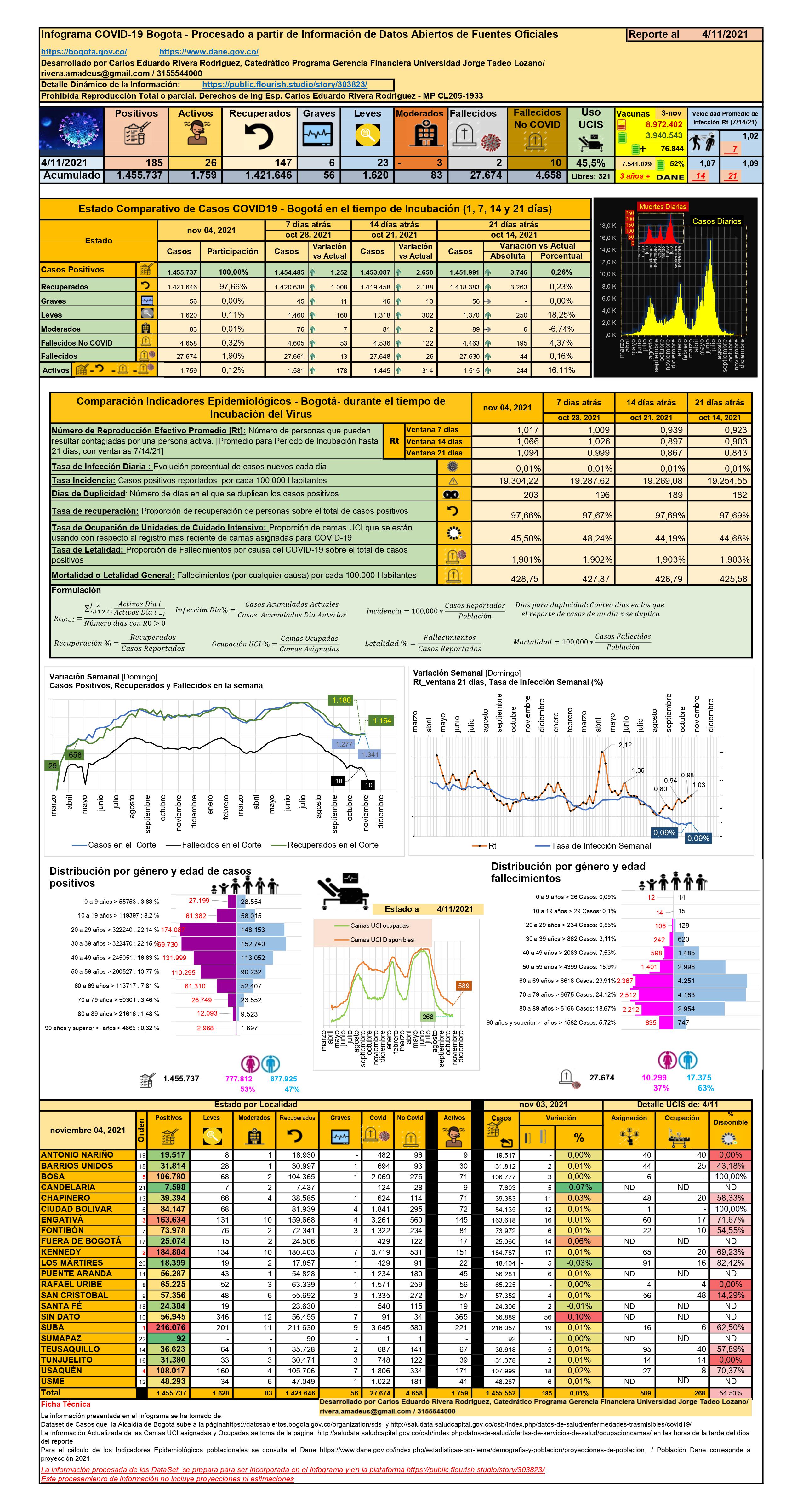 El número de reproducción Efectivo Promedio de 21 días, Rt21, viene en ascenso al pasar de 0.84 a 1.09, que va de la mano de la tendencia de la tasa de infección diaria al pasar de 0.010% a 0.013%; la tasa de ocupación de las camas en las Unidades de Cuidado Intensivo tuvo un leve incremento en 21 días al pasar del 44.68% a 45.50% (A 4 de Noviembre se tienen disponibles 268 camas de una asignación de 589).