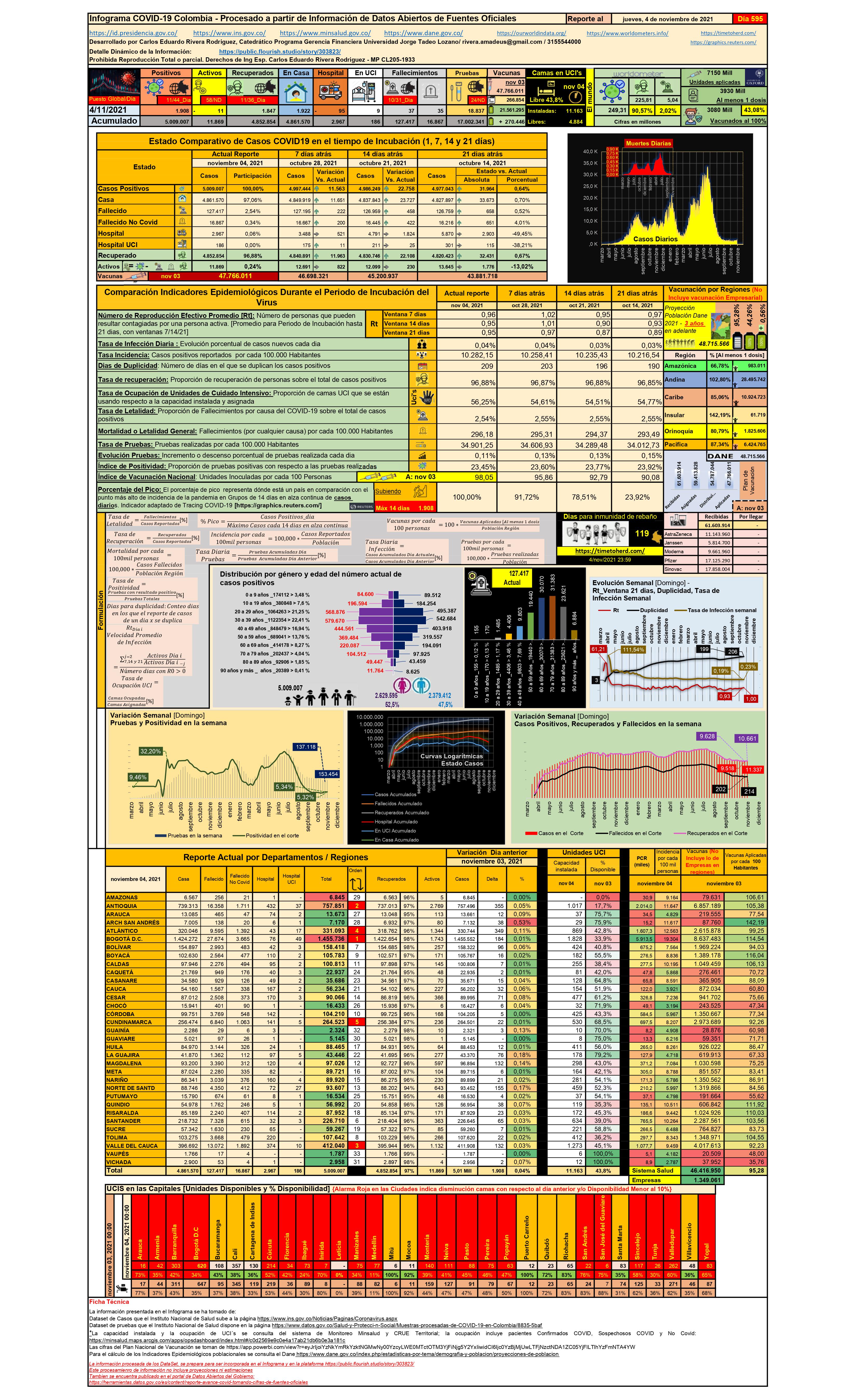 En medio del anuncio del Gobierno de presentación del carné de vacunación, hacemos un recorrido rápido al estado del Covid en el país a corte del 4 de noviembre y el comportamiento de los casos tipificados en la ventana epidemiológica de 21 días:
