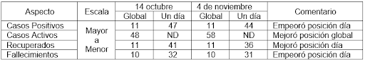 Un aspecto que permite analizar la ocurrencia de casos es el de las pruebas PCR, de las cuales a 4 de noviembre se han realizado 17’002.341, pero desde hace 21 días se tiene una tasa diaria en descenso al pasar del 0.15% al 0.11%, de allí que la positividad ha bajado del 23.92% al 23.45%.
