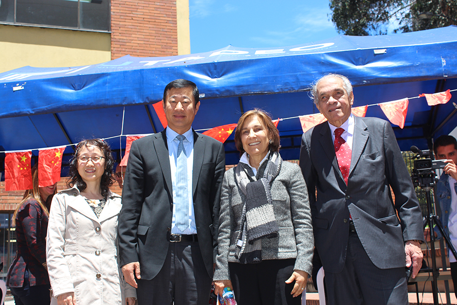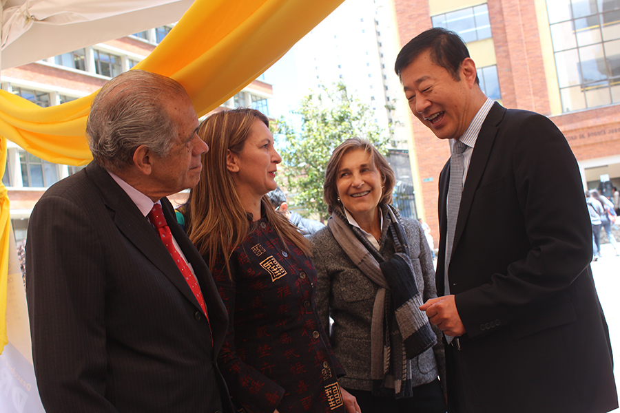 De izquierda a derecha, la directora Li, acompañada del embajador de China en Colombia, Li Nianping; la rectora de Utadeo, Cecilia María Vélez, y el director del Instituto Confucio de Utadeo, Enrique Posada.