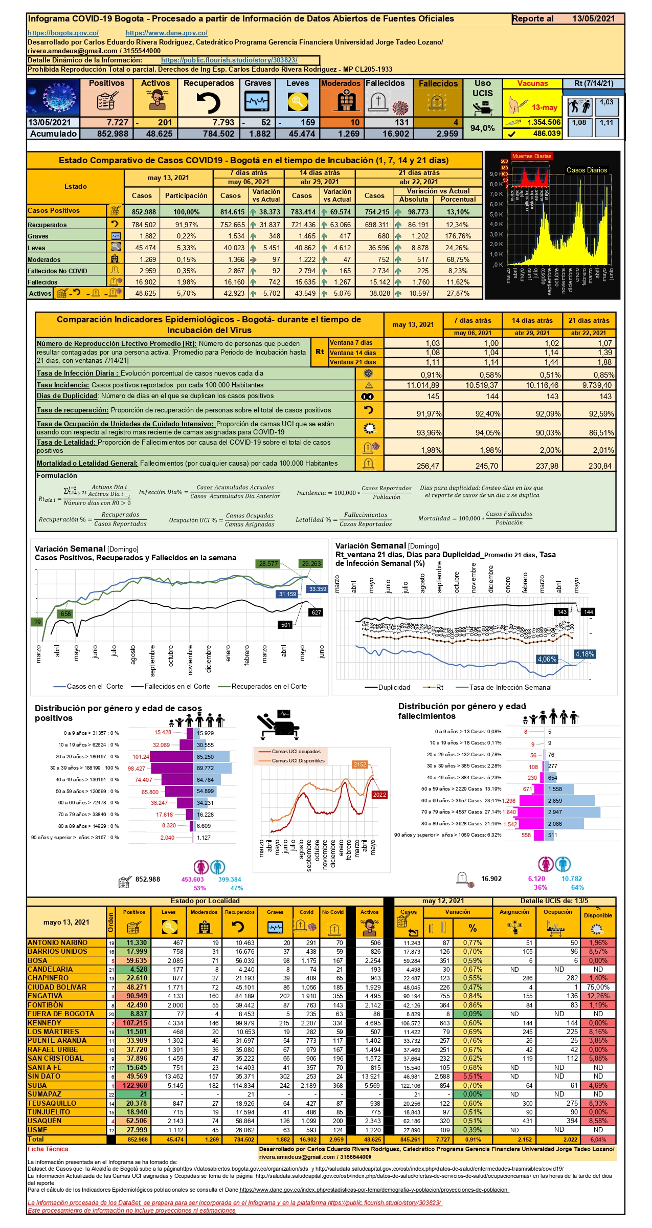 ¿Cómo estará circulando el Covid entre las constantes y multitudinarias congregaciones de personas en nuestro país por más de 15 días?, la respuesta la da el Rt (Indicador de velocidad promedio de infección), el cual medido en la ventana de 14 días, para el 28 de abril, era 1,07 (cada caso positivo puede infectar a 1,07 personas), y para el 13 de mayo es de 1,06, día para el cual se llegó a 3’067.879 casos positivos y 79.760 fallecimientos, ocupando el puesto 12 a nivel global de infección, puesto 6 en nuevos casos por día (13 de mayo con 19.160 eventos), puesto 10 en mortalidad y puesto 4 en muertes diarias (499 fallecimientos). Validando las cifras entre el 6 y 13 de mayo, se tiene que el Rt_7 días pasó de 0,90 a 1,10, lo que es el reflejo de la interacción de personas en las diversas marchas por todo el país, de forma que en 7 días se presentaron 116.778 nuevos casos y se produjeron 3.346 fallecimientos (la tasa de letalidad pasó en una semana de 2,59% a 2,60%, mientras que la tasa de infección diaria pasó del 0,56% a 0,63%). El registro de casos diario más alto que se ha tenido ocurrió el 15 de enero, con 21.078 casos; actualmente en ascenso del tercer pico, para darnos una idea de su ascenso, el 22 de abril nos encontrábamos en el 83,22% del pico anterior, para el 29 de abril 86,87%, 6 de mayo 82,76% y para el 13 de mayo 96,16%.