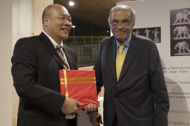 El artista Tian Yuemin, junto con el director del Instituto Confucio de Utadeo, Enrique Posada.