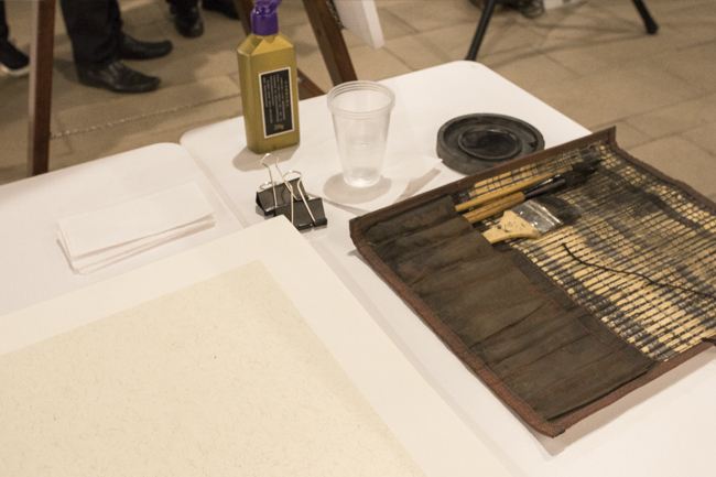 El directivo tadeísta señaló que la pintura china es la unión del pincel, la tinta, el papel y el espacio como narrativas. El primero de ellos es considerado por los chinos como una extensión de la mano del artista, que se selecciona de acuerdo a la propuesta que el pintor quiere hacer en su performance. Por su parte, la tinta, compuesta por agua con carboncillo, es única en la medida que el artista la prepara cada vez que pinta. En tercer lugar, el papel debe reflejar cada pincelada y ser fiel a los trazos y sombras planteados por el pintor, y así, en últimas, brindar la esencia del equilibrio como el principio más valioso para el arte chino, tratando de evitar la saturación de elementos en el espacio.