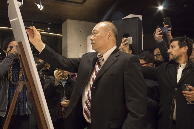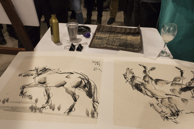 Todo estaba listo para una ocasión festiva, en la que cerca de 60 personas tuvieron la fortuna de observar una de las rutinas de pintura de Yuemin. Para asombro de muchos, el artista oriental en tan solo dos minutos creaba pinturas en óleo sobre papel de arroz, que hacían referencia a caballos en diferentes situaciones y posiciones. Pasaron quince minutos, y el artista logró pintar siete piezas, las cuales regaló a algunos de los asistentes, no sin antes colocar sobre ellas su sello característico de color rojo, que incluían unos caracteres chinos con sus iniciales.