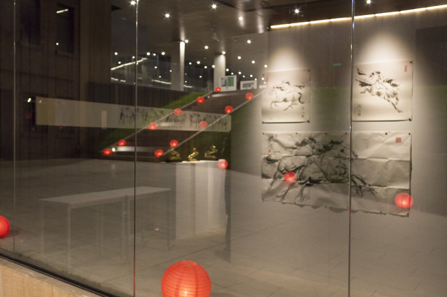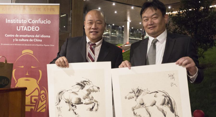 En medio de la oscuridad de la fría noche capitalina del 13 de febrero, un camino de los milenarios faroles rojos chinos se desplegaban desde la entrada al Edificio de Artes y Diseño de Utadeo, guiaban a los tadeístas y asistentes a las magnificas pinturas y tres pequeñas esculturas del escultor, pintor, educador y filántropo Tian Yuemin, quien inauguró su obra “El éxito del caballo”, en compañía del agregado cultural de la Embajada de China en Colombia, Sun Zhiheng, y el director del Instituto Confucio Utadeo, Enrique Posada.