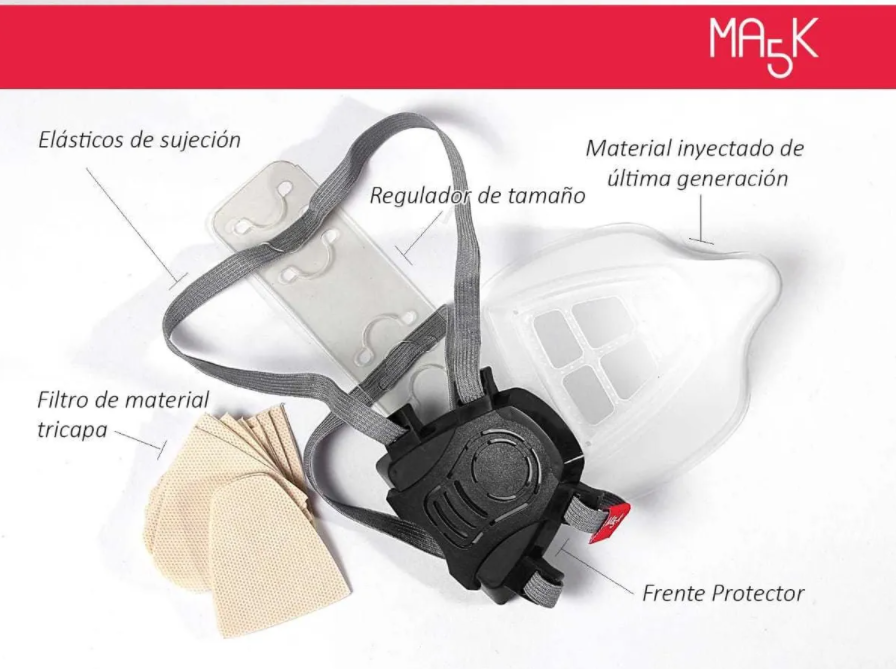 ‘Ma5k’ está hecha de silicona lucofon 94, adaptable al rostro y lavable, con un frente en propileno donde se aloja el filtro. Imagen: Cortesía - Carlos Suescún