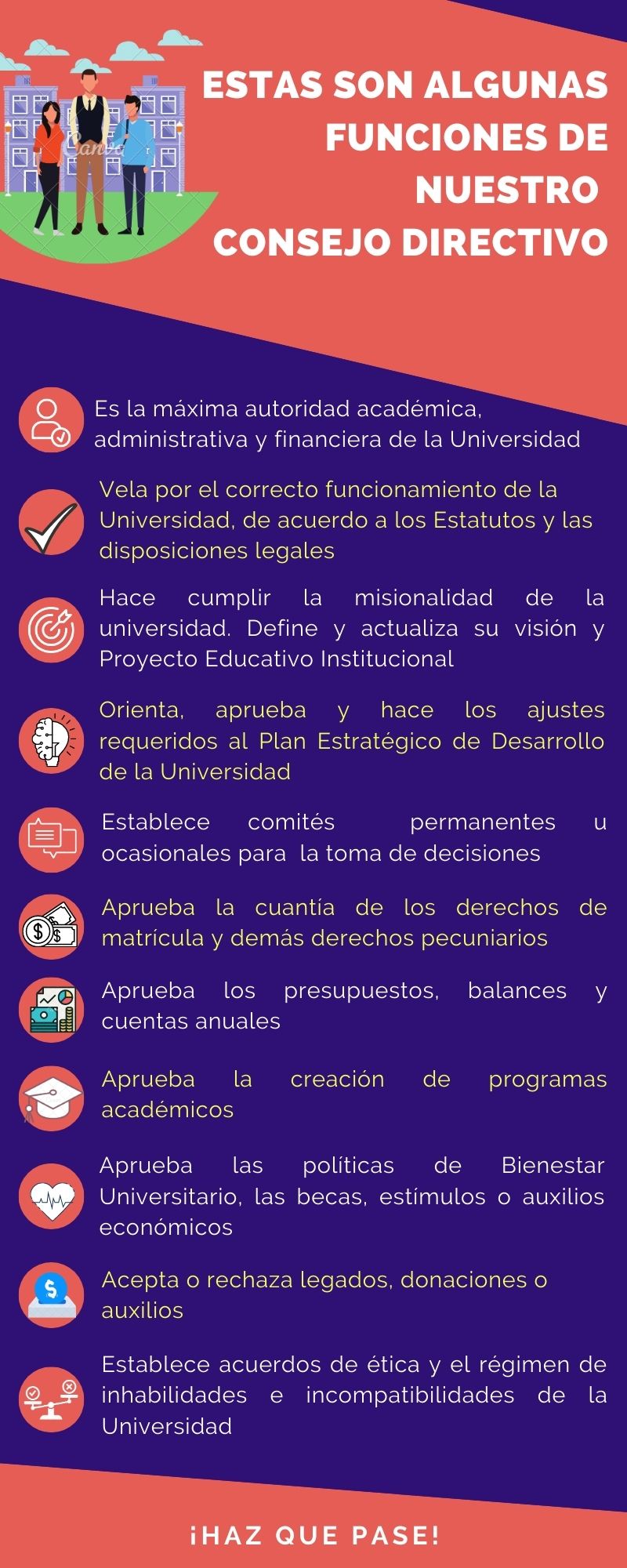¡Esta es tu oportunidad de hacer que pase! En tu vida como estudiante o profesor han surgido inquietudes, pero a la vez ideas innovadoras en torno a pensar una mejor universidad, desde lo académico, pero también en lo administrativo y financiero. ¿Sabías que los miembros del Consejo Directivo en representación de estudiantes y profesores tienen las mismas calidades que un consejero permanente, a la hora de tomar decisiones en pro de la Universidad?