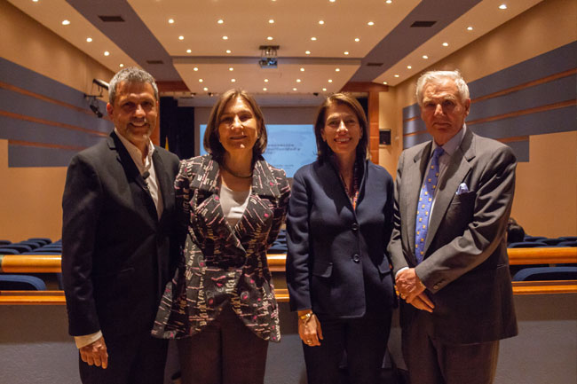 Orlando Ayala, junto a la rectora de Utadeo, Cecilia María Vélez, y los consejeros de Utadeo, Rosario Córdoba y John Vaughan