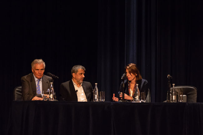 Luego de su conferencia, Ayala compartió su visión sobre la educación del futur y los retos en innovación y emprendimiento, con los consejeros de Utadeo, John Vaughan (izquierda) y Rosario Córdoba (derecha)