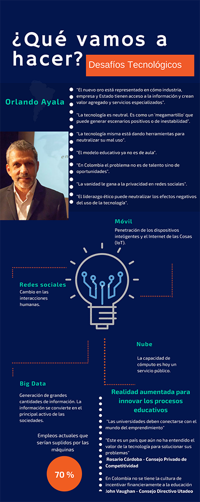 Así, por ejemplo, Ayala destacó que el uso de las tecnologías ha transformado los modelos de negocio, el mundo de las relaciones humanas y los principales fenómenos demográficos en el mundo. De este modo, nuevas generaciones como los Millennials piensan diferente, en relación con sus aspiraciones personales. Hoy sus formas de consumo y aprendizaje han cambiado, inclinándose, ya no por tener propiedades, sino por consumir servicios de manera ilimitada. De igual forma, las tecnologías han habilitado posibilidades impensables en el ámbito de la medicina y la salud, al ofrecer asistencia, prevención y tratamiento, incluso, en enfermedades que antes eran mortales. En cuanto a la urbanización, Colombia ha experimentado migraciones robustas del campo a la ciudad, situando su desarrollo económico en las urbes, lo cual en últimas significa un desafío en infraestructura vial, de vivienda y tecnológica.