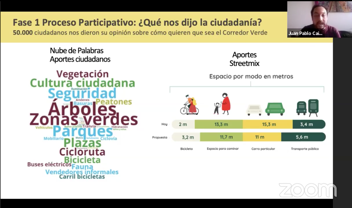 Por su parte, Diego Sánchez recordó que el IDU se ha transformado en pro de la ciudadanía en los últimos años, pasando de ser responsable de la infraestructura vial y de movilidad de la ciudad hacia un enfoque de planeación urbana integral, que pueden apreciarse en proyectos como el Cable Aéreo de Ciudad Bolívar, en donde no solo se ejecuta un sistema de transporte sino también un desarrollo social y económico en torno a la infraestructura. Bajo esa misma premisa se piensa desarrollar el proyecto del Corredor Verde.