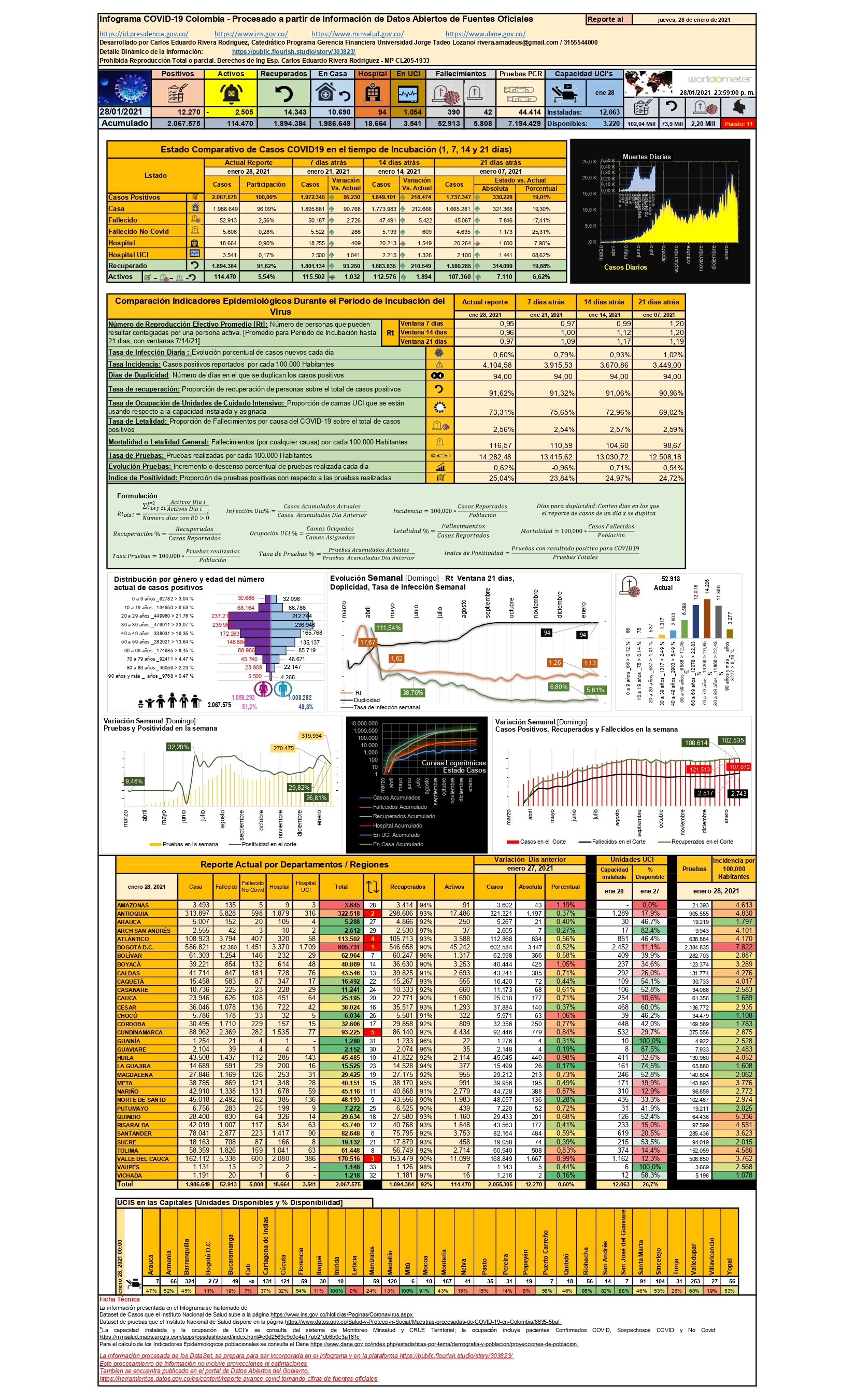 • Como resultado de las diversas medidas a lo largo del territorio Nacional, se aprecia disminución en el incremento de casos positivos desde hace tres semanas, y a 28 de enero, se tienen 2’067.575 casos positivos (incremento en 21 días del 19,01%, en comparación del 20,06% medido desde el 1º de enero). La incidencia o los casos positivos por cada 100.000 habitantes está en clara alza, debido a que este indicador se mide sobre los casos acumulados (cada vez mayores); actualmente es de 4.104 casos. En el ranking de nuevos casos en un día somos puesto 13 con 12.270 casos en comparación de la semana anterior, que era de 15.366 casos.