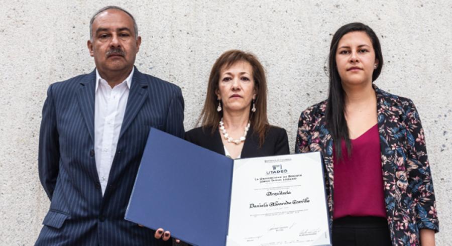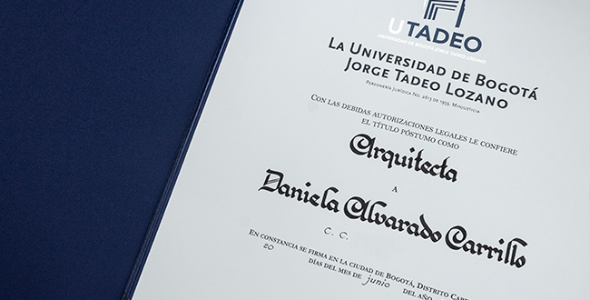 Tras seis años de lucha y perseverancia, Daniela Alvarado Carrillo, estudiante de los programas de Arquitectura e Historia del Arte de Utadeo, cerró sus ojos por última vez en este mundo, el 13 de noviembre de 2017. Tras siete meses de su fallecimiento, nuestra Universidad rindió un tributo a su memoria, a través de un grado póstumo en el que se le confirió el título de arquitecta, evento al que asistieron más de quince personas, entre ellos sus padres, hermana, familiares y amigos de Universidad.