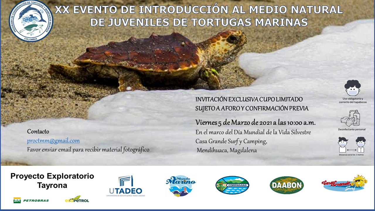 Como parte del Día Mundial de la Vida Silvestre, que se celebró el pasado 3 de marzo, este viernes 5 de marzo, a las 10:00 a.m., se llevará a cabo, en la playa de Casagrande Surf (Mendihuaca - Km 27 vía Riohacha), el XX evento de Introducción al medio natural de juveniles de tortugas marinas, organizado por el Programa de Conservación de Tortugas y Mamíferos Marinos (ProCTMM), el cual cuenta con el apoyo de Utadeo Santa Marta, el Proyecto Exploratorio Tayrona (Petrobras – Ecopetrol), el Acuario Mundo Marino, Grupo Daabon y Corpamag, aliados fundamentales de este proceso.