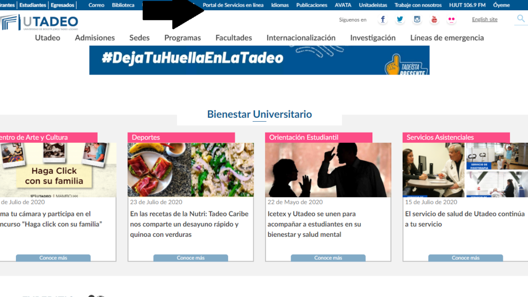 Ten en cuenta que el acceso sigue siendo el mismo. Ingresas a través de la página web de Utadeo y en la parte superior encontrarás un menú en el que podrás ubicar el Portal de Servicios en Línea, donde podrás acceder de manera fácil. Si presentas algún inconveniente, puedes comunicarte con la Mesa de Estudiantes.