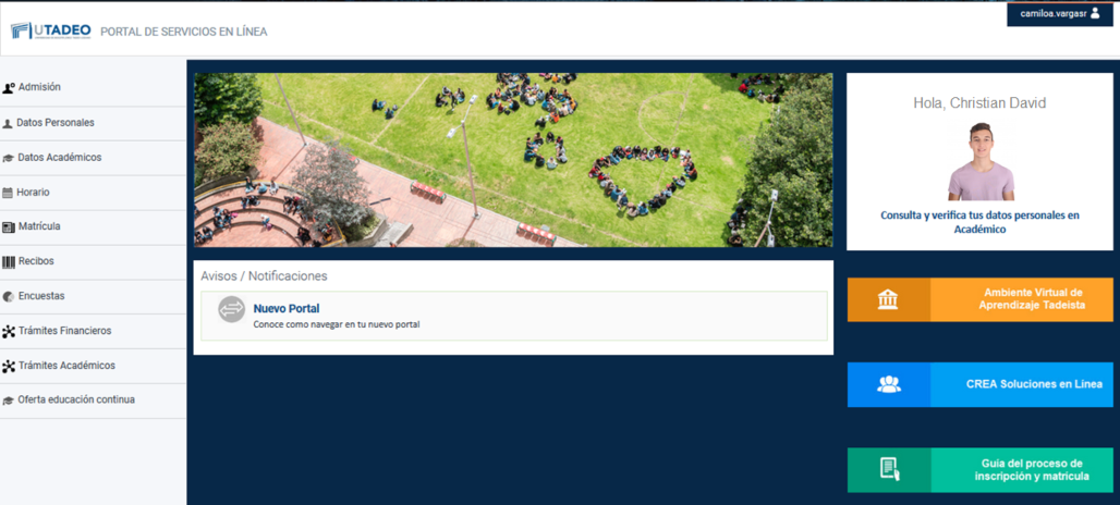 Un dato clave: En este nuevo diseño encontrarás una nueva funcionalidad y es el menú de datos personales, donde podrás ver los datos básicos que están guardados en la Universidad.