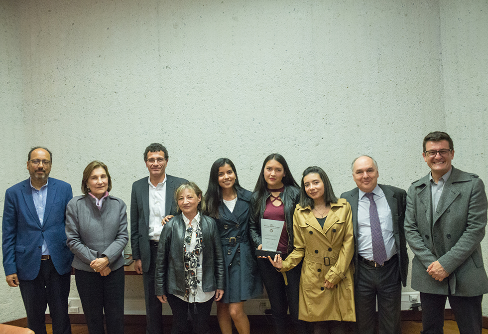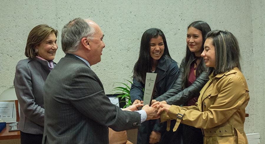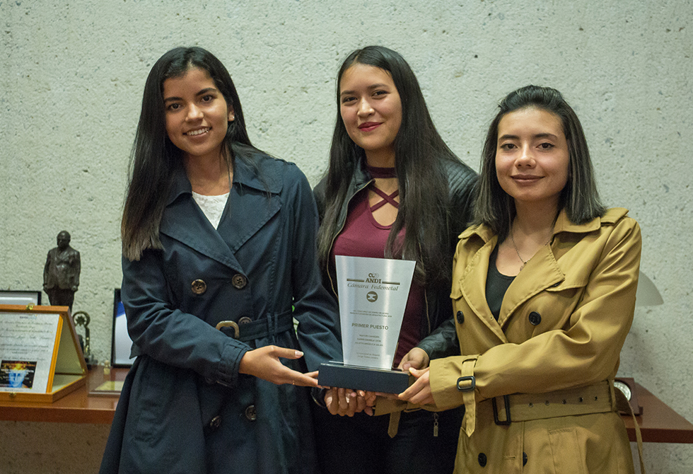 En presencia de la rectora Cecilia María Vélez, las estudiantes Julieth Angélica Salas, Daniela León Carillo y Mayuri Caviedes Sánchez recibieron el reconocimiento de la mano del Director Ejecutivo de la Cámara Fedemetal Juan Manuel Lesmes, luego de ocupar el primer puesto en el 12º concurso Alacero de Diseño en Acero para Estudiantes de Arquitectura, organizado en Colombia por la Cámara Fedemetal de la ANDI.