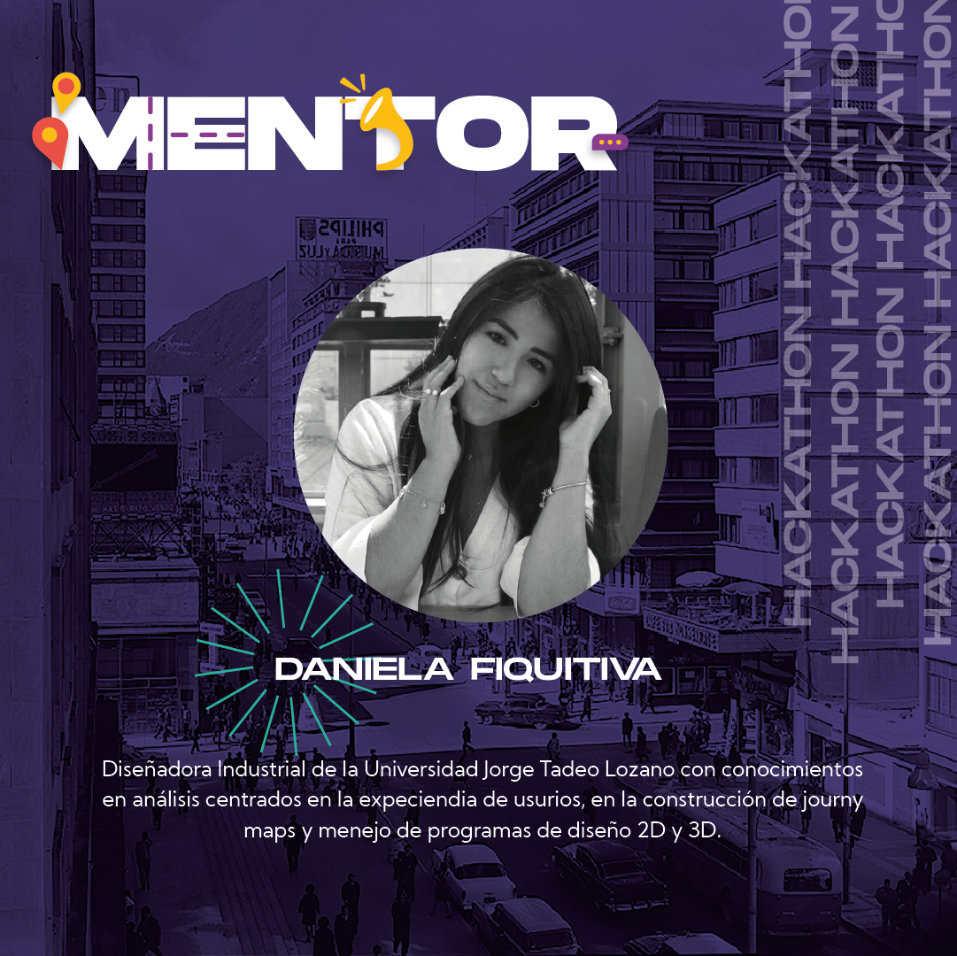 - Daniela Fiquitiva - MentoraDaniela Fiquitiva - Mentora: Diseñadora industrial de Utadeo con conocimientos en análisis centrados en la experiencia de usurarios, en la construcción de journy, maps y manejo de programas 2D Y 3D.