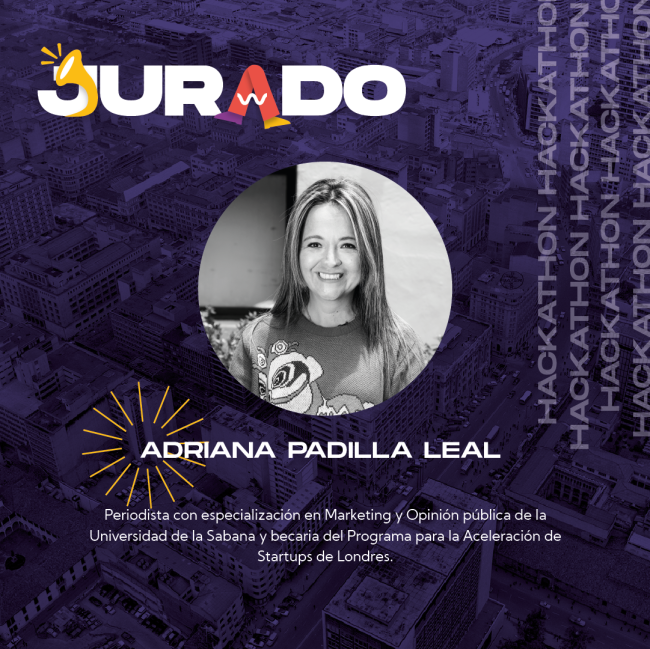 - Adriana Padilla - JuradoAdriana Padilla - Jurado: Periodista, con especialización en Marketing y Opinión Pública de la Universidad de la Sábana y becaria del programa para la Aceleración de Startups del School for Creative Startups de Londres. Actualmente se desempeña como la Directora de la Fundación Gilberto Alzate Avendaño de Bogotá, donde gerencia proyectos como el Bronx Distrito Creativo, entre otros. Adriana Padilla - Jurado: En la Cámara de Comercio de BogotÁ dirigió el sector de Industrias Creativas y Culturales, liderando las agendas especializadas de desarrollo productivo. Igualmente es cofundadora y directora de las plataformas Bogotá Audiovisual Market – BAM y Bogotá Music Market – Bomm. Ha sido conferencista invitada en eventos como el RHI Thinks Arts, Culture & Business (Lisboa, 2019). El encuentro de “Alto nivel de representantes ministeriales e institucionales de cultura de Iberoamérica (Sao Paulo, 2019) el Encuentro de la Convención sobre la protección y promoción de la diversidad de las expresiones culturales Unesco (Paris, 2019), el BIME – Mercado Internacional de Música (Bilbao, 2017) y el WOMEX World Music Expo (Budapest, 2015).