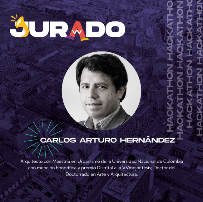 - Carlos Hernández - JuradoCarlos Hernández - Jurado: Arquitecto graduado en el año 1993 de la Universidad Nacional de Colombia. En 1995 fundó en compañía del también arquitecto Alexander Díaz Pulido la oficina Hernández y Díaz Arquitectos, que funcionó por más de doce años y donde se desarrollaron múltiples proyectos arquitectónicos y urbanos. Cuenta con estudios de posgrados en la Maestría en Urbanismos de la Universidad Nacional de Colombia con mención honorífica y premio Distrital 2003 a la mejor tesis de maestría en todas las áreas. Doctor en Arte y Arquitectura de la Universidad Nacional de ColombiA, dirigida por el maestro Alberto Saldarriaga Roa, sustentada en mayo de 2017 y propuesta para ser Laureada por los jurados. Profesor de arquitectura desde el año 2001 en la Universidad Nacional de Colombia y de la Especialización en Diseño Urbano. Desde el año 2004 es profesor de tiempo completo e investigador con la Universidad Jorge Tadeo Lozano. En esa institución, también fue decano del programa de Arquitectura por 6 años, Director Académico durante dos años, Director de Innovación y Apoyo Académico durante dos años y Director Académico y de Aseguramiento de la Calidad hasta diciembre de 2017. del 2018 al 2020 es decano de la Facultad de Ciencias del Hábitat en la Universidad de la Salle.