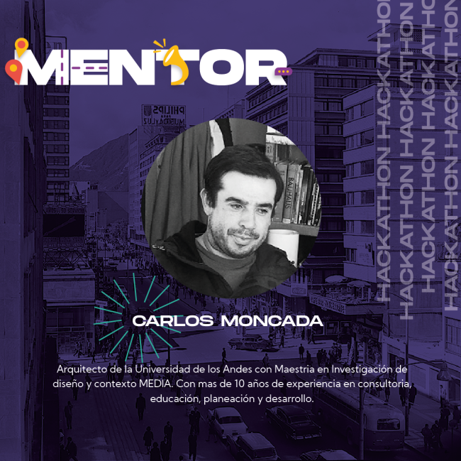 - Carlos Mocada - MentorCarlos Mocada - Mentor: Arquitecto de la Universidad de los Andes con Maestría en investigación de diseño y contexto MEDIA. Con más de 10 años de experiencia en consultoría, educación, planeación y desarrollo.