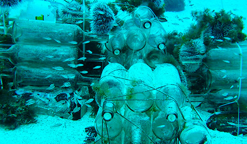 La de Francisco se titula “De la arena al arrecife, reciclando botellas de vidrio como sustratos de asentamiento en el Caribe”. La iniciativa de este proyecto es emplear botellas de vidrio como superficies para el asentamiento de organismos marinos. Incluye, peces, corales, algas, gusanos poliquetos y crustáceos, así como otras especies que se adhieren cuando se crean superficies nuevas. “Recolectamos muchísimas botellas de vidrio para armar módulos tridimensionales que sirvan de refugio para macrobiota animal. Intentamos darle un uso viable a este tipo de residuos sólidos en la isla de San Andrés (puesto que la disposición del reciclaje allá es nula), y por otro lado evaluamos la cantidad de vida que comienza a asociarse a las estructuras. El objetivo último es lograr el asentamiento de corales sobre esta superficie. El vidrio tiene de ‘especial’ que es un material inerte, es hecho de arena, casi completamente de Sílice, así que no libera toxinas mientras está sumergido”.