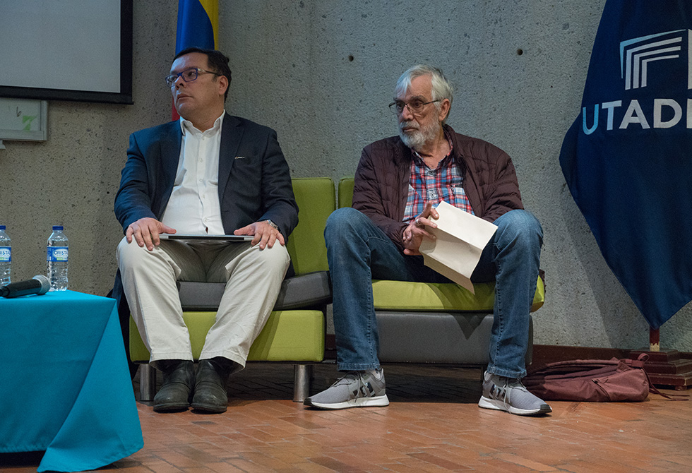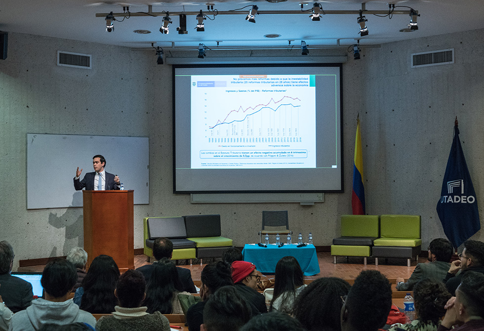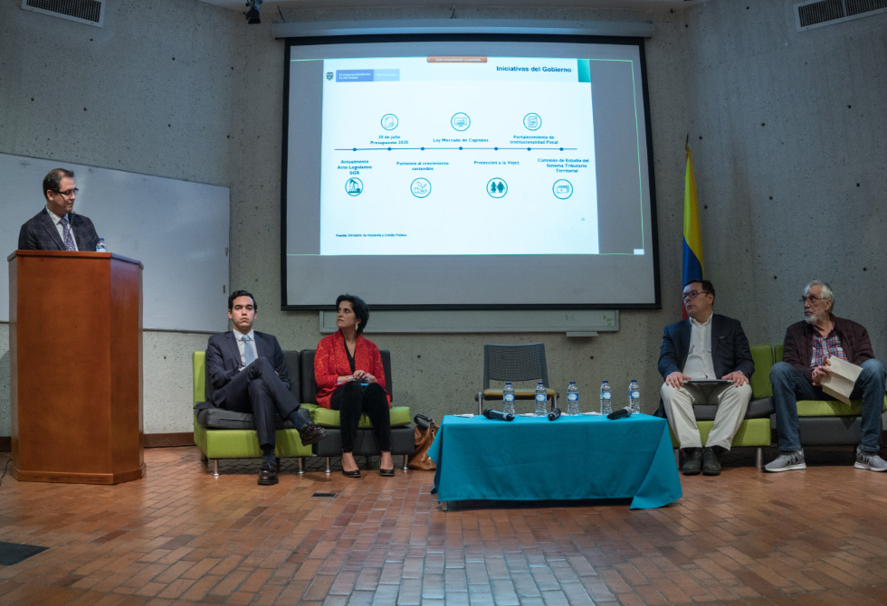 El Marco Fiscal de Mediano Plazo se creó desde el 2003 en Colombia, mediante la Ley 819 de Responsabilidad Fiscal, como una herramienta para que las administraciones públicas y territoriales analicen sus finanzas públicas, con el fin de darles credibilidad y transparencia, así como tomar decisiones sobre las políticas de ingresos y gastos. Como parte de la apuesta del Ministerio de Hacienda y Crédito Público de socializar el contenido de este nuevo Marco Fiscal presentado por el actual Gobierno nacional, el viceministro técnico de esa cartera, Luis Alberto Rodríguez, expuso la síntesis de este documento en Utadeo, en un conversatorio que contó con el análisis del profesor emérito de la Universidad, Salomón Kalmanovitz; el profesor del Departamento de Economía, Comercio Internacional y Política Social, Daniel Castellanos, y la subdirectora de Fedesarrollo, Ximena Cadena.