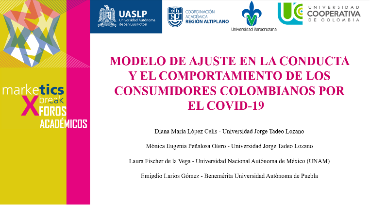 Dentro de los trabajos resultados de investigación, López y Peñalosa, en coautoría con Laura Fischer de la Vega, de la UNAM (México), y Emigdio Larios Gómez, de la BUAP (México), presentaron la ponencia titulada Modelo de ajuste en la conducta y el comportamiento de los consumidores colombianos por el Covid-19.