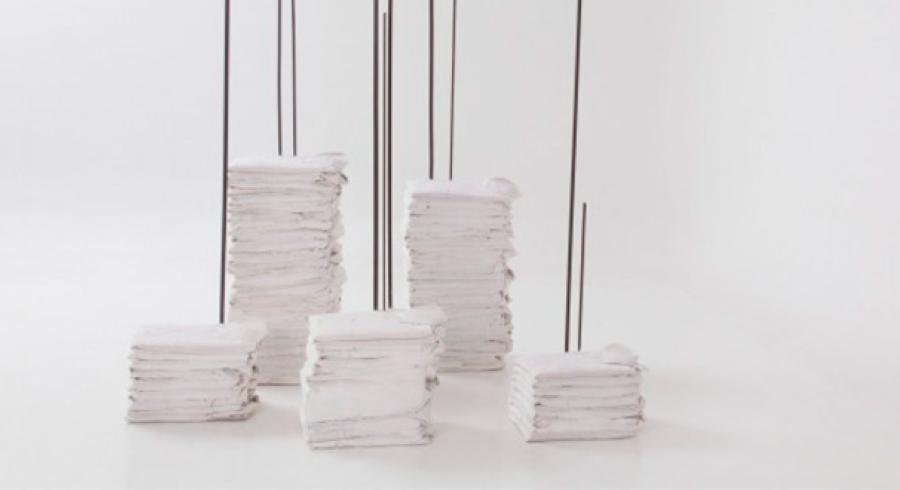“Sin título” (1988-1990) está elaborada con camisas blancas delicadamente dobladas y almidonadas con yeso, apiladas y ensartadas en varas metálicas que se alzan a diferentes alturas, creando un ritmo visual que, en conjunto, produce una imagen turbadora. Una escultura simbólica capaz de conmover y establecer una comunicación con el espectador tanto a nivel físico como espiritual.