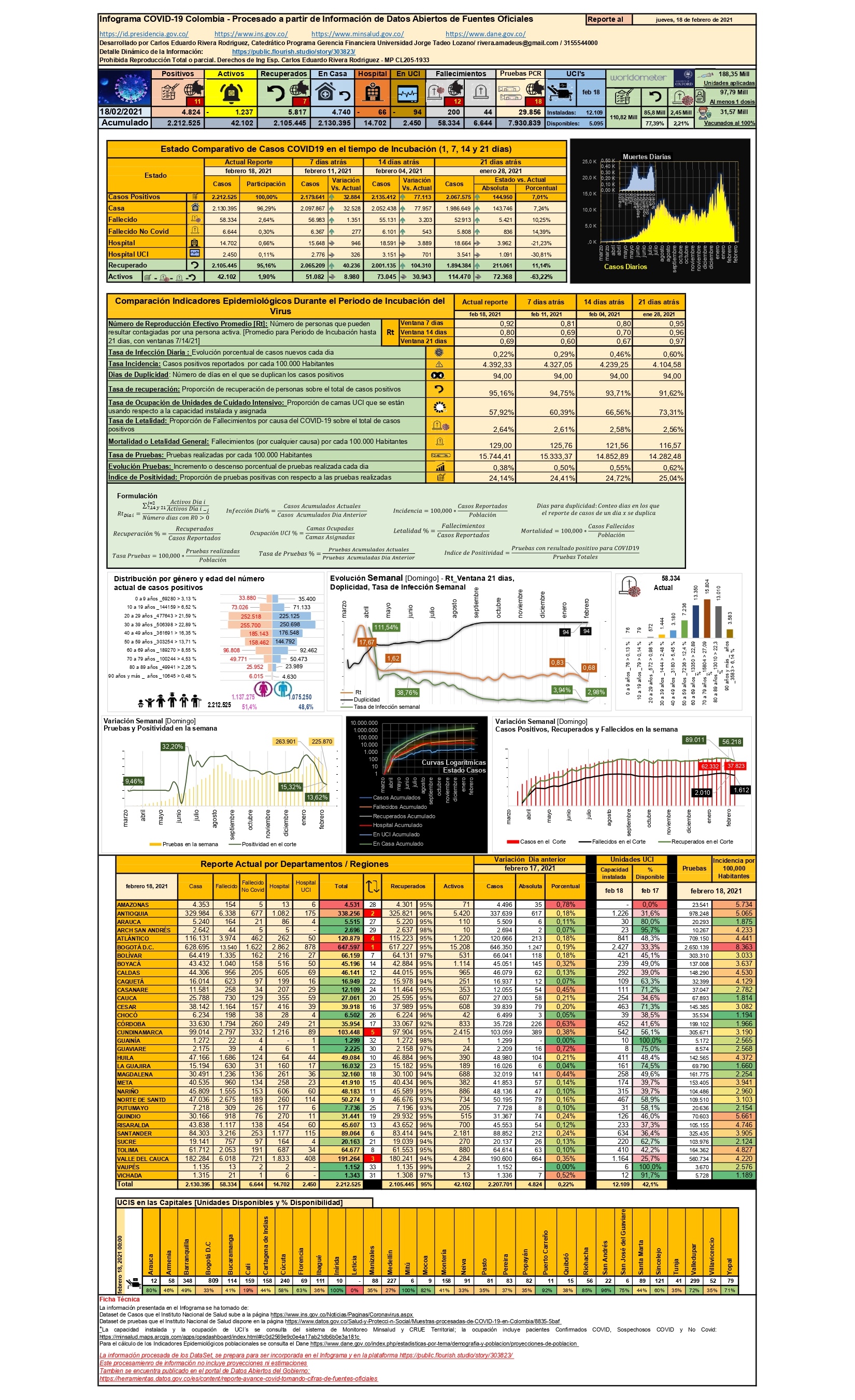 • El 18 de febrero se llegó a 2’212.525 casos positivos (puesto 11 a nivel mundial y puesto 2 en Sudamérica): 58.334 fallecimientos (2,64% del total de casos), 2’105.445 pacientes recuperados (95,16% del total); el segmento de casos activos es de 42.102 personas (1,90% del total). Evaluando el comportamiento diario, a corte de este artículo, se tuvieron 4.824 nuevos casos en un día (puesto 11 a nivel mundial), así como 200 fallecimientos en el mismo día (puesto 12 a nivel mundial)