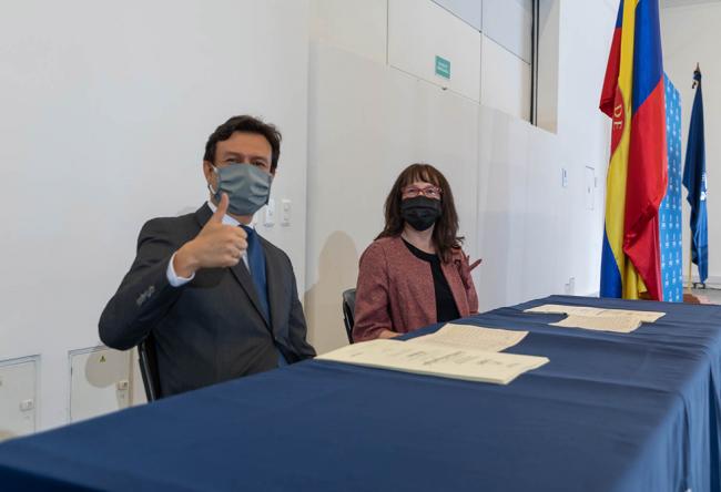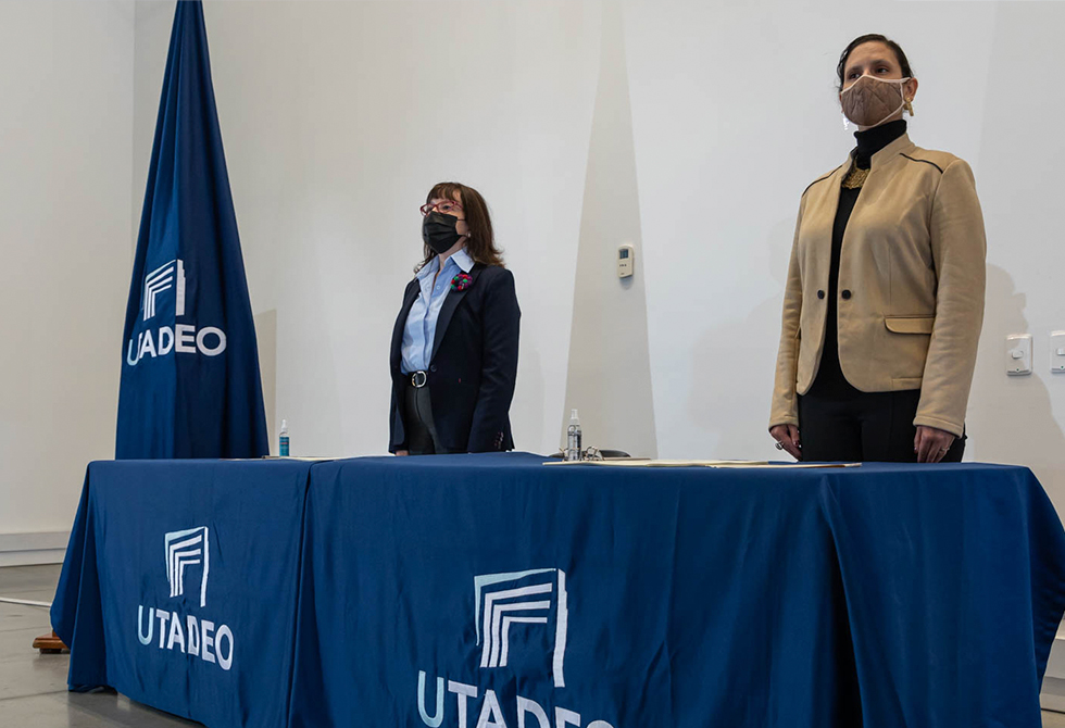 - Revive las ceremonias presenciales de entrega de diplomasEl decano de la Facultad de Ciencias Sociales, Mario Molano, y la secretaria general de Utadeo, Lina Cepeda, acompañaron a los graduandos.