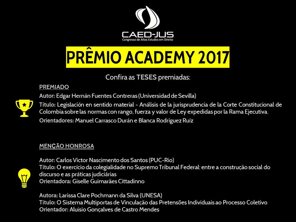 Dicho premio identifica y reconoce el mérito de tesis y disertaciones de maestría en Derecho y áreas afines en español, portugués e inglés, cuyos resultados son de alta calidad, innovación e impacto para el campo. Para la versión 2017, la Comisión de Evaluación estuvo compuesta por los profesores Paula Arévalo (Colombia), Tiago Gagliano y Thiago Pereira (Brasil).
