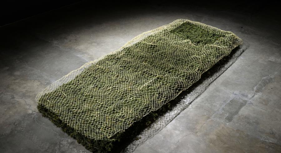 Cuerpo de Leche es el resultado de un trabajo que desarrolla la artista desde el 2018 y es un manto tejido con hilos de leche que siguen la forma de la tumba de su abuelo que reposa sobre un manto de ruda. “Esta obra nos conecta con ese curso de agua, con la potencia del alimento que nos dirige a nuestra primera memoria de vida cuando fuimos amamantados”, señala Góngora.