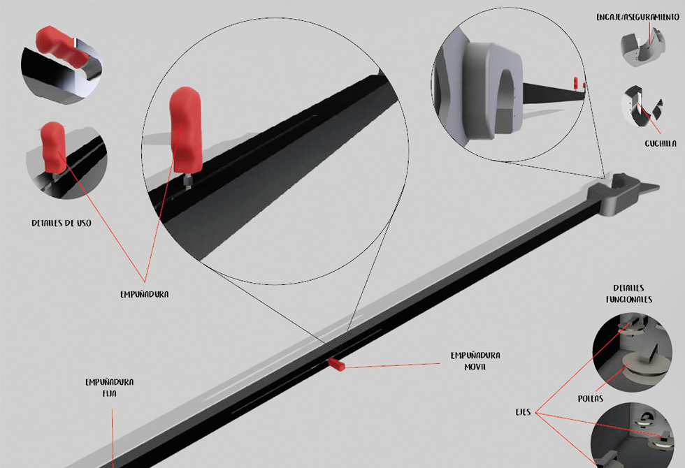 La primera propuesta es Bastón Nova, una herramienta creada por Marla Guarín, Plinio Arrazola y Pablo Clavijo, y que cuenta con una serie de poleas y cuchilla móvil e intercambiable que está sostenida por remaches y que, a la vez, en su cabezal, posee una cuchilla superior.