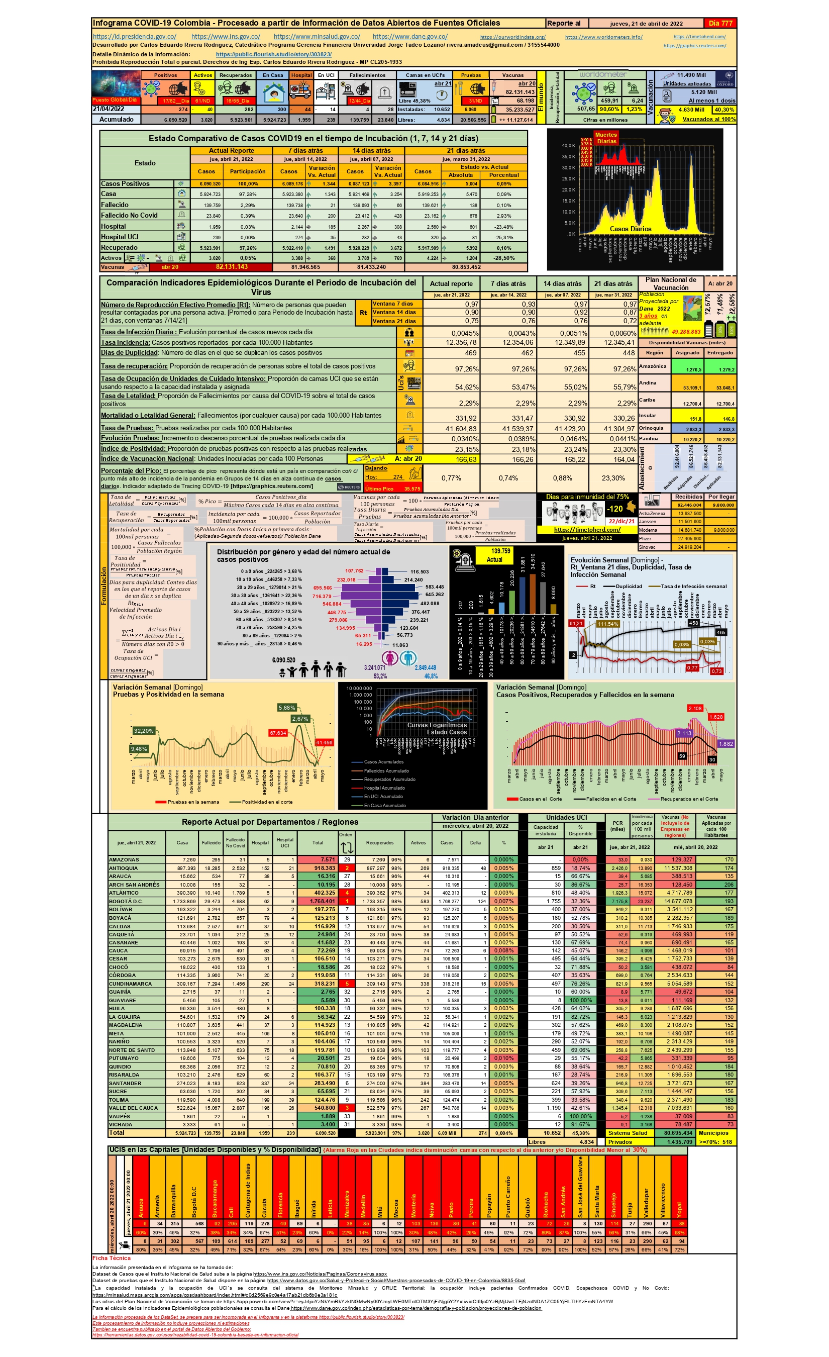 30 días atrás contados desde el 21 de abril se ha tenido un máximo de casos nuevos por día de 366 eventos [25 de marzo] y un mínimo de 122 nuevos casos [17 de abril], se ha tenido en el mismo periodo de tiempo una tasa de infección diaria máxima del 0,006% y una mínima de 0,002%; el número de reproducción efectivo en la ventana de 7 días, evaluado día a día no ha superado la cifra de 0,75 y en las ventanas de 14 y 21 días, no se ha superado el umbral de 0,97 [Recordemos que este indicador representa el número de nuevos casos que un caso positivo identificado puede generar], con esta tendencia a corte del 21 de abril se ha llegado a una identificación de 6’090.520 casos positivos en Colombia lo que nos hace ocupar a nivel de incidencia global el puesto 17 en el planeta [worldometers.info] y a nivel de incidencia diaria el puesto 62, [Para el 21 de marzo se ocupaban las posiciones 17 y 59], claro es que entre mas alejados estemos del primer lugar esto implica una mejoría notable.