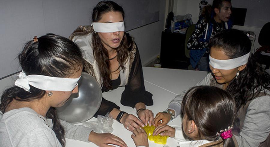 El átomo es considerada la parte más pequeña que compone la materia, a tal punto que no es posible ser visto por medio de un microscopio común, dadas sus dimensiones que oscilan entre 0,5 a 1 nanómetro, equivalente a una mil millonésima parte de un metro. Ante ello, podría decirse que “A nivel atómico, todos somos ciegos”, una analogía que Alis Pataquiva, profesora del programa de Ingeniería Química, hizo realidad el pasado 6 de mayo, en el Aula Colaborativa, cuando cerca de quince niños invidentes del Colegio República China aprendieron todo sobre el mundo de la nanotecnología, con la ayuda de estudiantes de último semestre del programa de Ingeniería Química de Utadeo, quienes se colocaron en situación de pares con sus invitados, a través de unas vendas que cubrieron sus ojos y la oscuridad total del salón.