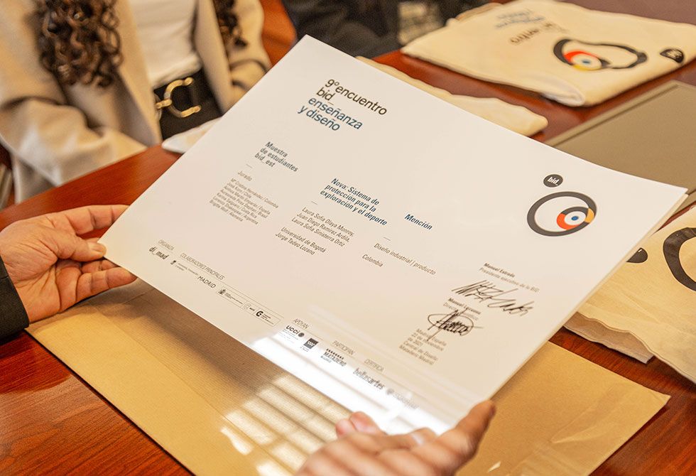 Este año los embajadores tadeístas del diseño en el 9º Encuentro BID fueron: Laura Sofía Olaya Monroy, Juan Diego Ramírez y Laura Sofía Sinisterra, estudiantes de Diseño Industrial quienes cursan sexto semestre y participaron con el proyecto NOVA, que consiste en un sistema de exploración que plantea una nueva percepción del desarrollo de deportes extremos, el cual vela por el confort y la seguridad del deportista.
