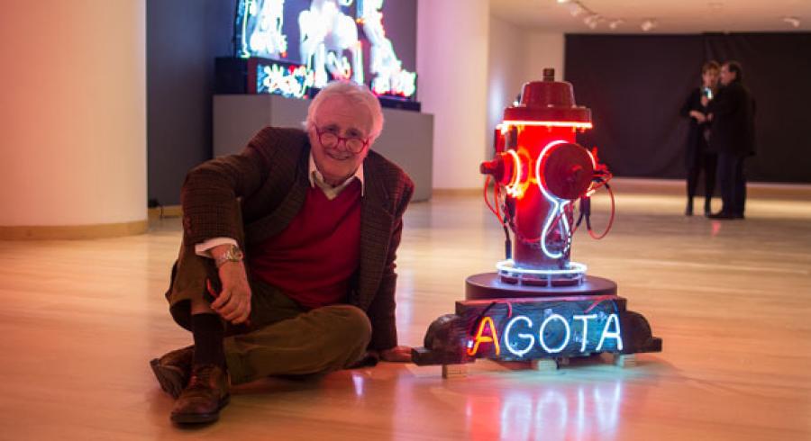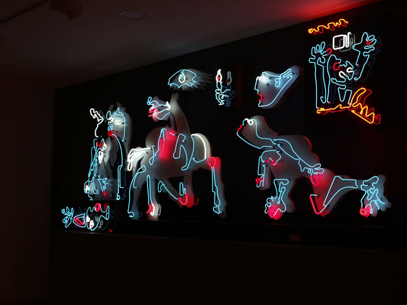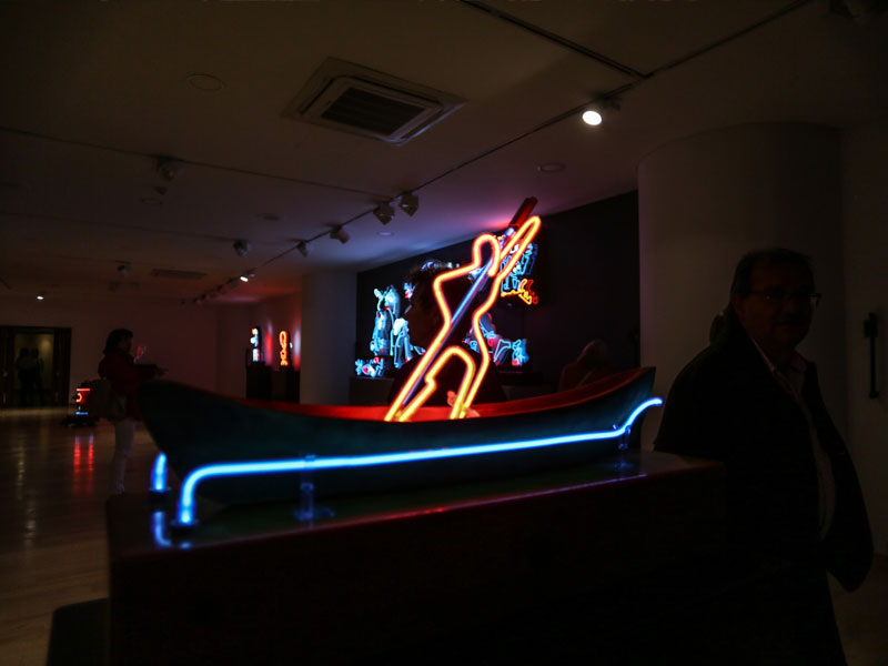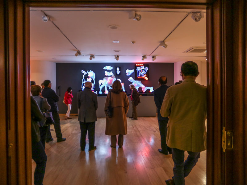 El pasado 11 de julio, la exposición abrió sus puertas al público general con una visita guiada a cargo de Schrader y del curador del club, Carlos Alberto García. Se trató de un recorrido de carácter cercano y ameno a través de las 16 figuras de neón que componen la muestra, aunque también significó un acercamiento a los pensamientos e inquietudes del artista.