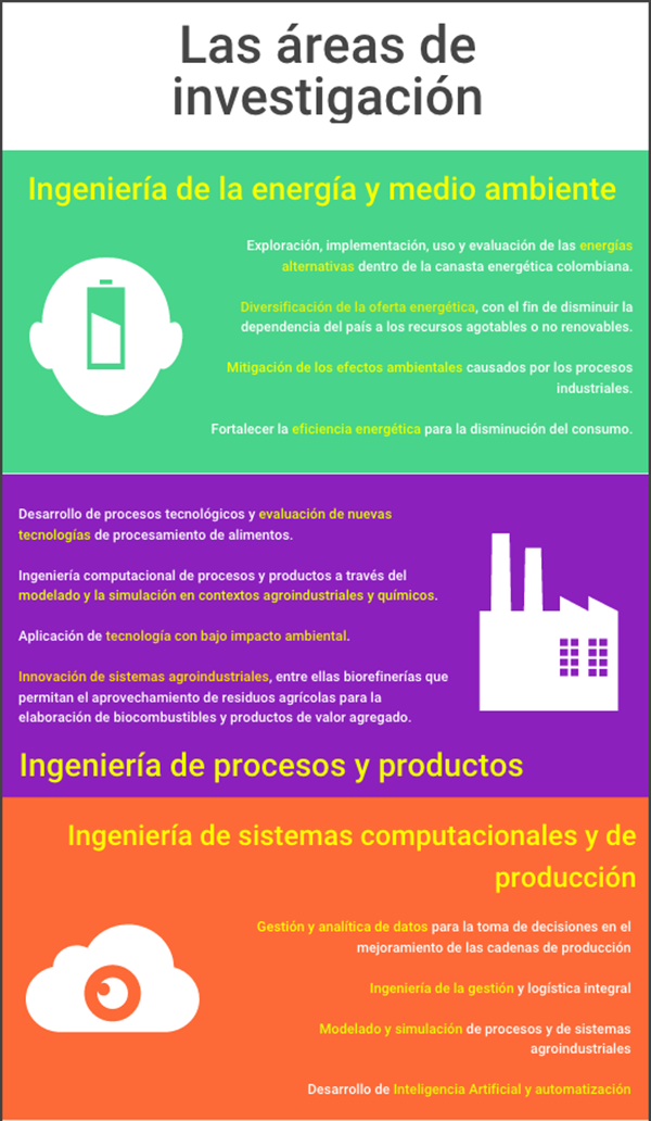 “El doctor en Ingeniería tendrá un ambiente propicio para fortalecer sus competencias de manera que pueda aportar soluciones innovadoras a los retos actuales del país y el mundo, aprovechando nuevas tecnologías y haciendo uso del modelado y la simulación; en cuanto a energías alternativas podrá estudiar su implementación para diversificar la oferta energética, la obtención de biocombustibles y los bioprocesos para aprovechar los residuos agroindustriales (materia seca vegetal). Así mismo tendrá capacidades de generar procesos menos contaminantes, acordes a los principios de la ingeniería verde o podrá incursar en el análisis de grandes volúmenes de datos, para la toma de decisiones que mejoren los sistemas productivos”, resalta Conde, quien agrega que “otra de las apuestas se centra en el desarrollo de alimentos con características funcionales que presenten altos estándares de calidad, alto valor nutricional y obedezcan a las tendencias del consumo saludable”.