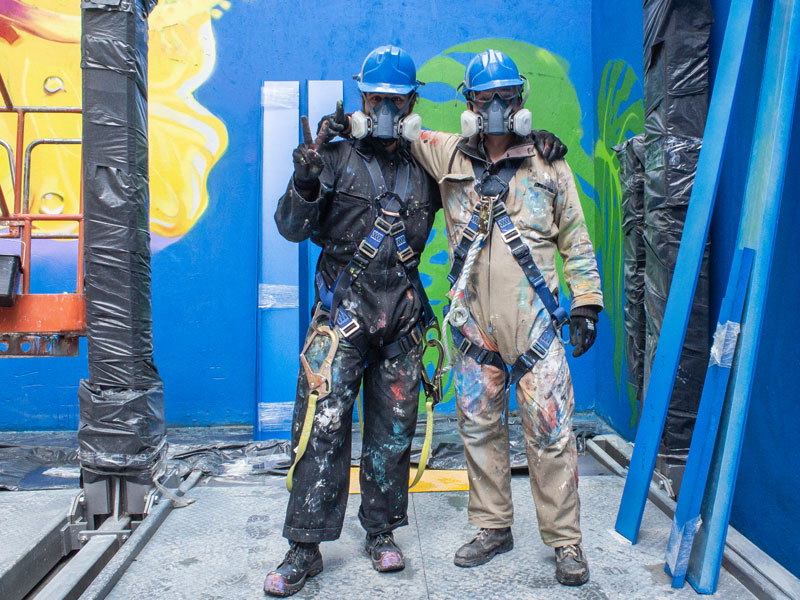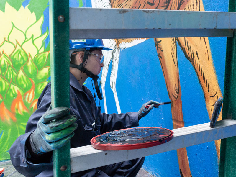 La intervención del muro inició el pasado martes 17 de julio, en jornadas de 8:00 a. m. a 5:00 p. m. “Trabajamos todo el día. La verdad se pasa súper rápido el tiempo pintando”, señala Sofía Cruz, estudiante de quinto semestre del programa de Artes Plásticas.