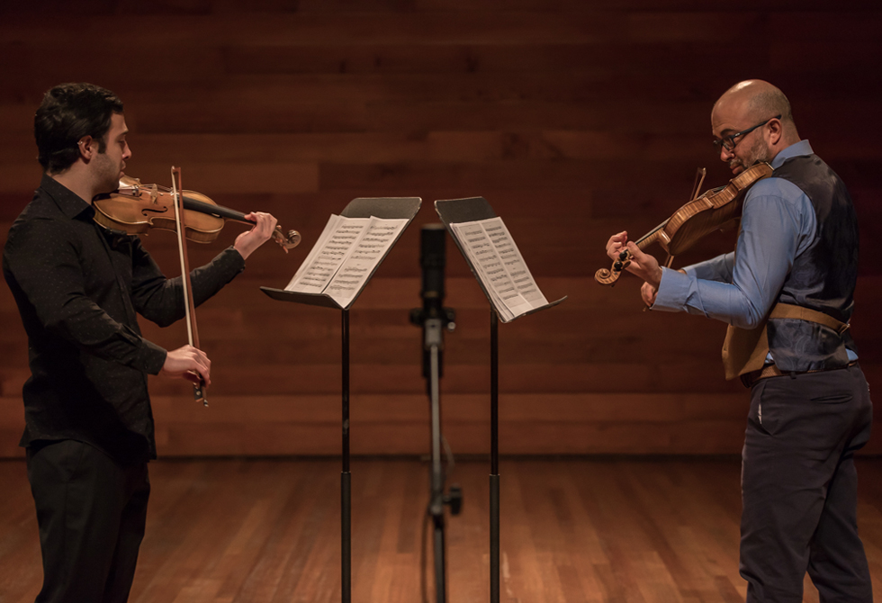 Camilo Trujillo, estudiante de la Maestría en Gestión y Producción Cultural y Audiovisual de Utadeo, y Santiago Trujillo, director del Área Académica de Cinematografía, hicieron el acompañamiento musical de la ceremonia