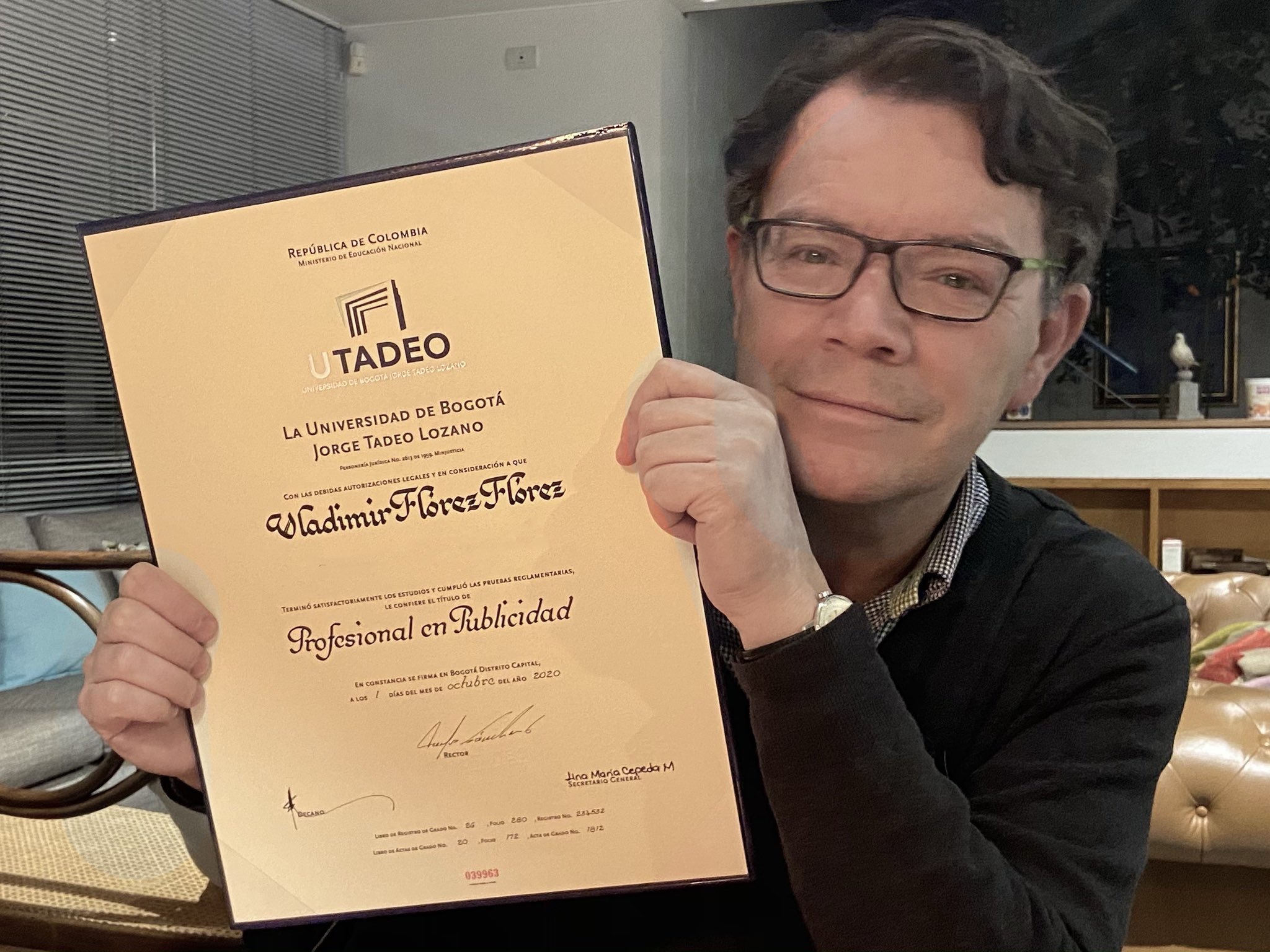 "Vladdo" con su diploma que lo acredita como profesional en Publicidad. Cortesía: Twitter @Vladdo