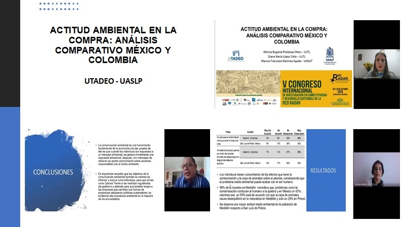 En este espacio, que se desarrolló de forma virtual y que tuvo como sede a Argentina, las profesoras Mónica Peñalosa y Diana López presentaron sus dos trabajos de investigación sobre hábitos de consumo de plataformas móviles de transporte individual en jóvenes universitarios bogotanos y mexicanos y actitud ambiental en la compra, en alianza con la Universidad Nacional Autónoma de México (UNAM) y la Universidad Autónoma de San Luis de Potosí (UASLP).
