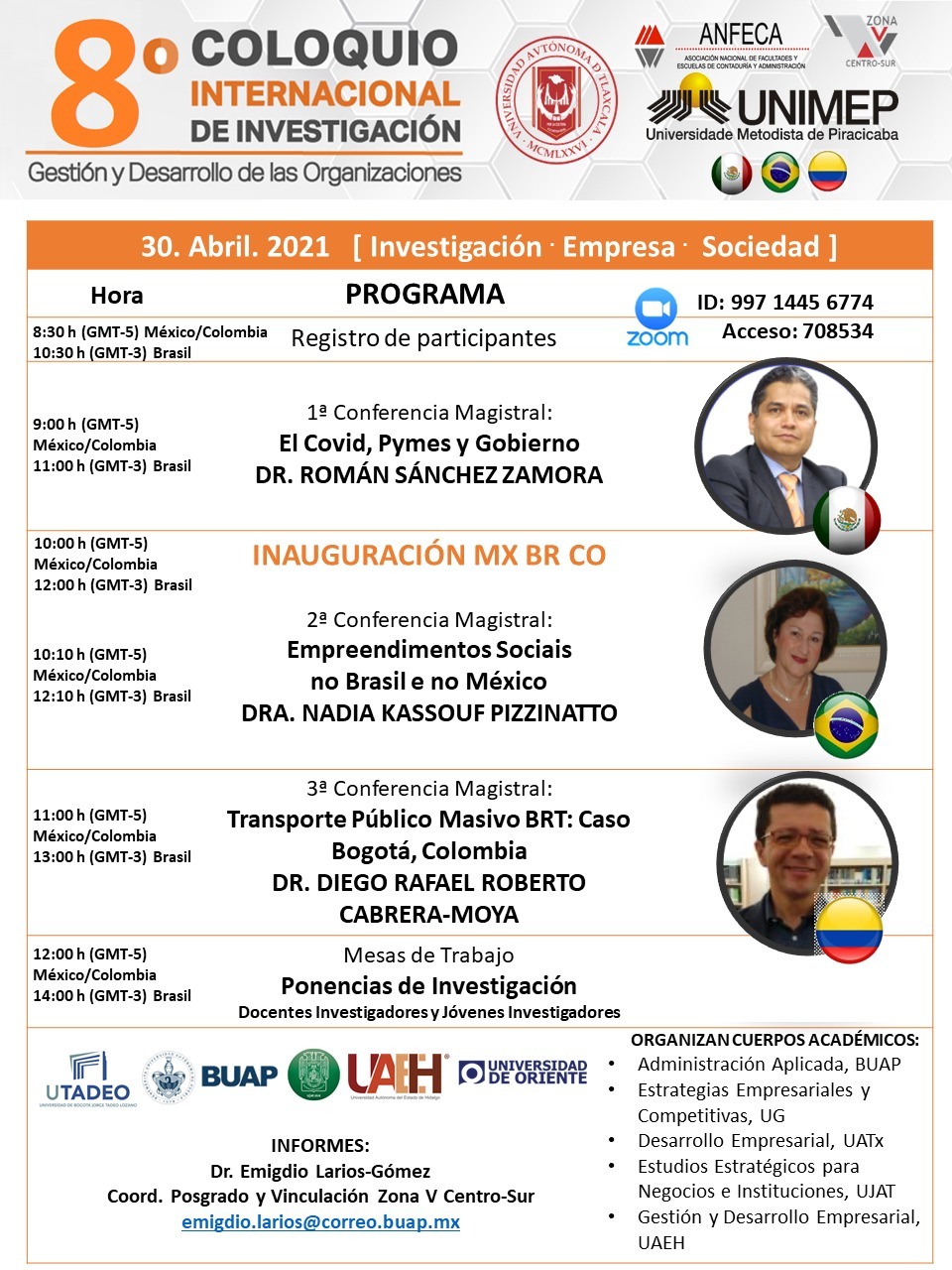 En un encuentro académico entre México, Brasil y Colombia, la Asociación Nacional de Facultades y Escuelas de Contaduría y Administración (ANFECA), la Zona V Centro Sur, a través de la Coordinación de Posgrado y Vinculación Nacional e Internacional, la Universidad Metodista de Piracicaba y la Universidad Jorge Tadeo Lozano organizan el 8º Coloquio Internacional de Investigación "Gestión y Desarrollo de las Organizaciones", el cual se llevará a cabo el próximo 30 de abril, de manera virtual, a partir de las 8:30 a.m., a través de Zoom