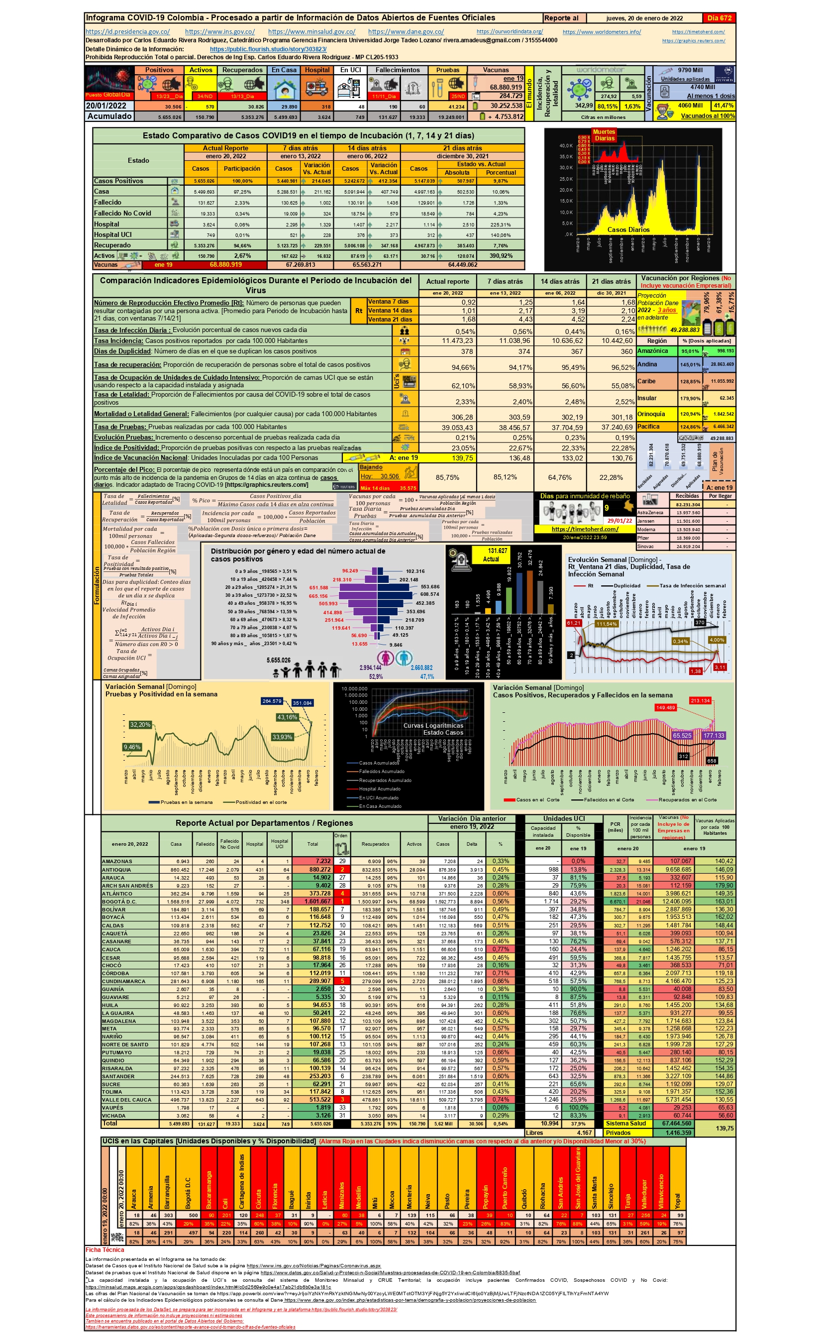 Antes de detallar las cifras de la Pandemia en Colombia, se presentan las cifras globales a corte del 20 de enero presentadas por la Universidad de Oxford y el portal worldometers.info: Se tiene una incidencia de 342,99 millones de casos, se han recuperado 274,92 millones de personas [80,15%], se han presentado 5,59 millones de muertes [1,63%], se han aplicado 9.790 millones de dosis de la vacuna, de las cuales cuentan con al menos una dosis 4.740 millones de personas y 4.060 millones tiene el esquema total de vacunación.